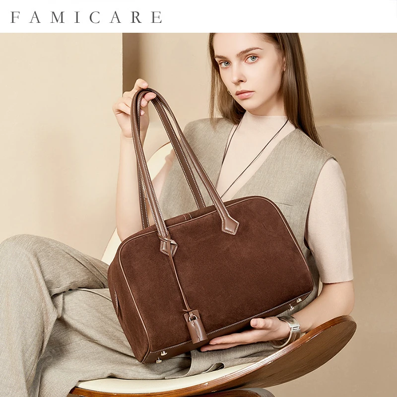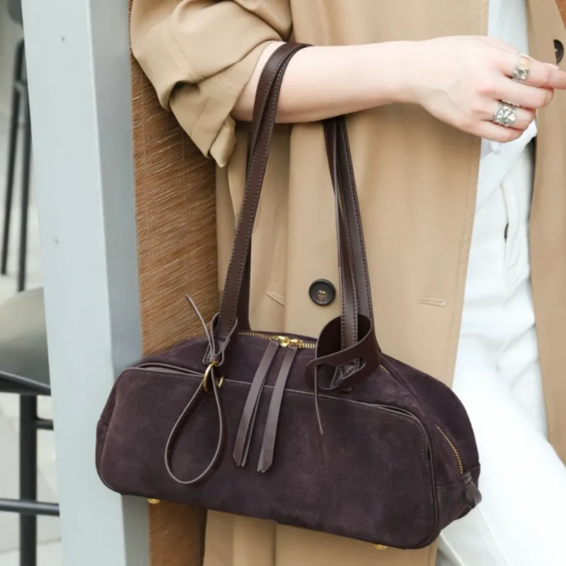 $25.00Women Business Premium Versatile Boston Bag 2025 New Suede Leather Bowling Handbag Large Capacity Underarm Single Shoulder Pack