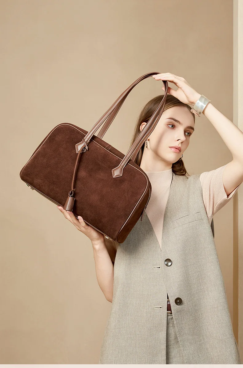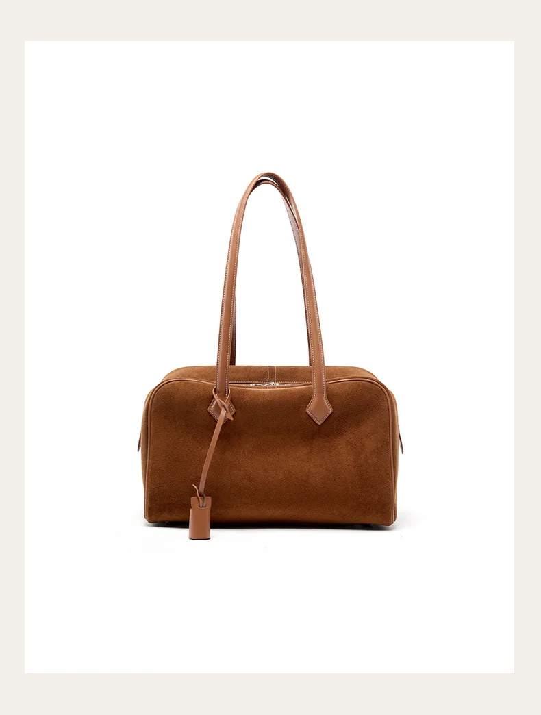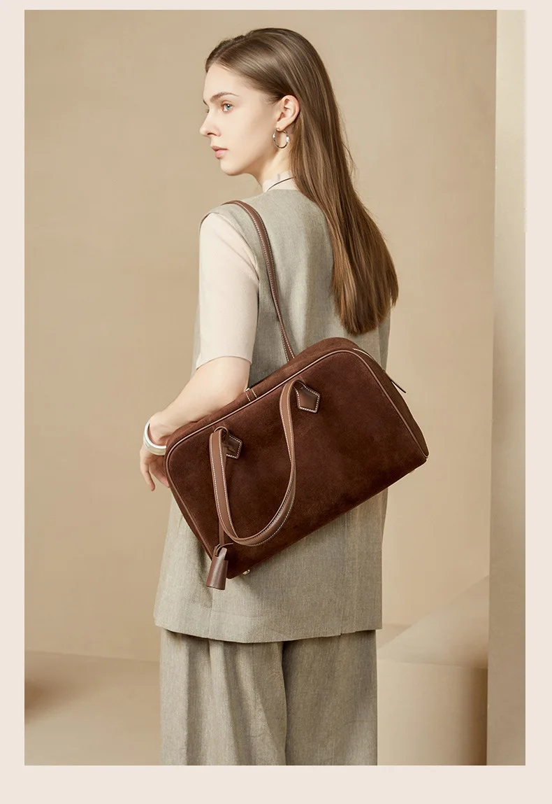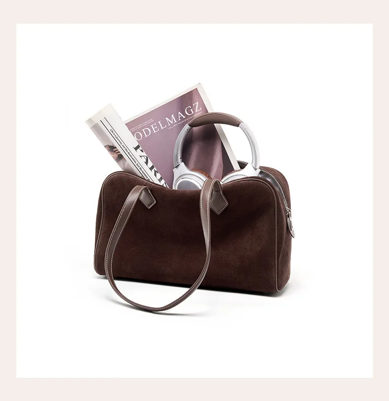 Women Business Premium Versatile Boston Bag 2025 New Suede Leather Bowling Handbag Large Capacity Underarm Single Shoulder Pack